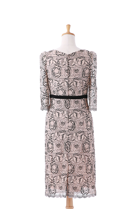 ベージュに黒バラがあしらわれた総レースのドレス。ハイウエストにマークされた黒ベルトがポイント。