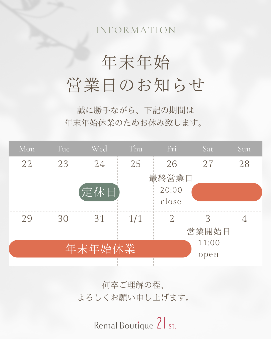 いつもレンタルブティック21st.をご利用頂き誠にありがとうございます。